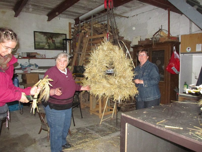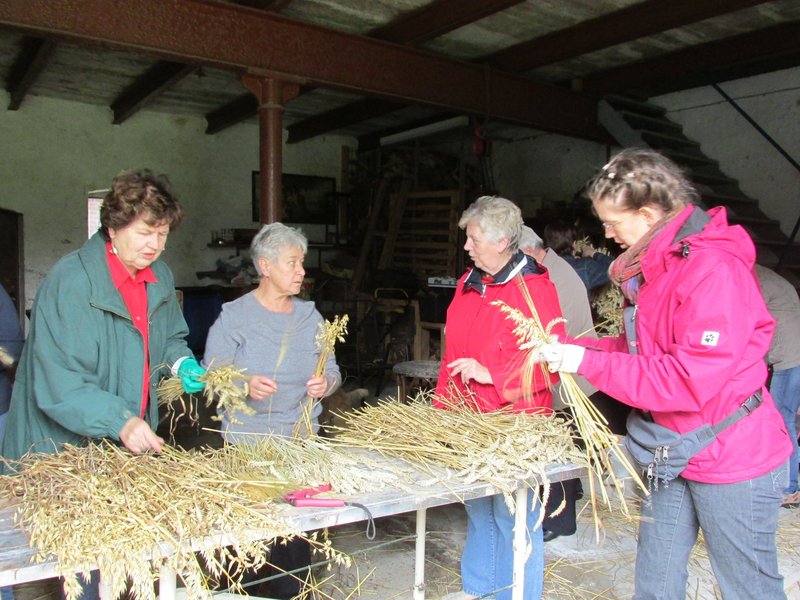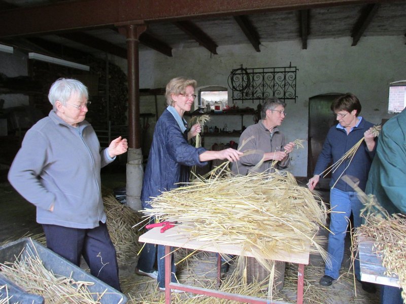 Am 23. September trafen sich die Frauen vom Frauenkreis der evangelischen Kirchengemeinde unter Leitung von Rita Geermann und einige Konfirmandinnen sowie Pastorin Petra Wesemann und ihre jüngste Tochter in der Scheune von Marlene Hansen, um eine neue Erntekrone für die Marienkirche zu binden. Aus Hafer, Weizen-, Roggen- und Gerstenähren banden die fleißigen Helferinnen kleine Sträußchen. Diese wurden an Karin Ahlers und Irma Helms weitergereicht, welches die einzelnen Sträußchen mit Draht um das Metallgestell der Erntekrone festbanden. Bei der Arbeit gab es einen regen Austausch zwischen Alt und Jung. Welcher Halm zu welcher Getreidesorte gehört, wurde von erfahrenen Landwirtsfrauen erklärt. Und Karin Ahlers erzählte stolz: „Dies ist schon das 2. Mal, dass ich eine Erntekrone binde, und das, obwohl ich doch eigentlich aus der Stadt bin.“ Die alte Erntekrone war erst 6 Jahre alt. Aber im letzten Jahr wurde festgestellt, dass sich der Kornkäfer über das Getreide hergemacht hatte. Darum beschloss der Frauenkreis, in diesem Jahr gemeinsam eine neue Krone zu binden. Die meiste Erfahrung damit hatte Irma Helms. „Meine erste Erntekrone habe ich mit 16 Jahren gebunden,“ erzählt sie, „damals war ich in der Landjugend.“ Und eigentlich ist es für die inzwischen 77 jährige Irma Helms auch ein Jubiläum, denn diese Krone ist die 10. Erntekrone, die sie bindet.