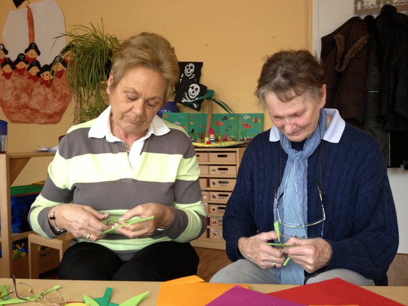 Am Donnerstag, 28. Februar 2013, besuchten sechs Damen des Besuchsdienstkreises die Dienstag-Donnerstag-Nachmittagsgruppe des evangelischen Kindergartens mit Silke Oppermann und Sabine Heinzel als Gruppenleiterinnen. Nach kurzem Kennenlernen und miteinander Reden während der sogenannten Milchpause wurde ein langer Basteltisch eingerichtet. Gemeinsam mit Alt und Jung wurden dann unter Sabine Heinzels Anleitung Papierblumen und Blüten aufgemalt und ausgeschnitten, zusammengesteckt und geklebt. Die Kinder durften ihre Werke anschließend mit nach Hause nehmen, die Besuchsdienstmitarbeiterinnen hatten ihre Papierblumen für die nächsten Geburtstagsbesuche in der Gemeinde hergestellt. Auf beiden Seiten - Kindergarten wie Besuchsdienst - war am Ende des Nachmittags die einhellige Meinung: Das hat viel Spaß gemacht - so eine Bastelaktion sollten wie unbedingt einmal wiederholen!