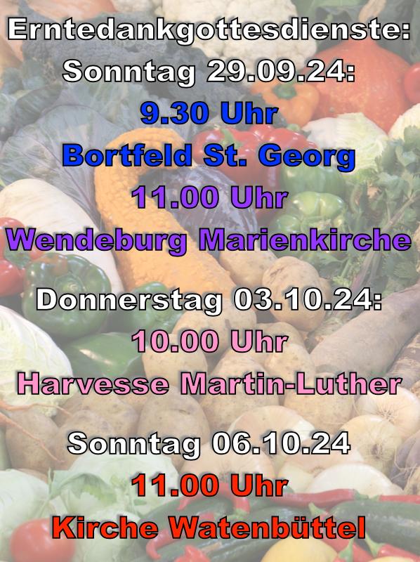 In diesem Jahr finden zwischen dem 29.9. und 6.10. insgesamt vier Erntedankgottesdienste im Pfarrverband statt.