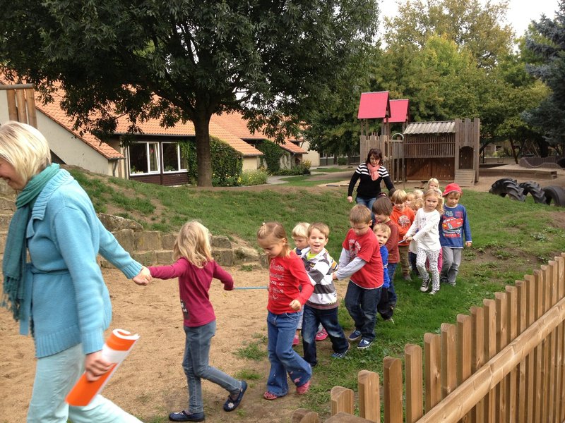 Um ihr gelerntes Wissen unter Beweis zu stellen wurde eine Übung durchgeführt, in der die Rauchmelder absichtlich ausgelöst wurden und alle Gruppen mit den Erzieherinnen das Haus verlassen mussten. Hierbei demonstrierten die Kinder Ihr zuvor Gelerntes: Kurzerhand wurden die geschlossenen Gruppentüren mit am Boden liegenden Decken und Tüchern verschlossen und alle stellten sich an die bereitgelegte Rettungsleine, um dann den Gruppenraum über die Terrassentür zu verlassen. Aufregend für alle Kinder war, dass jeder seine Hausschuhe anbehielt und ohne Jacke rausgehen musste. Dank des guten Wetters war das ohne Probleme möglich.