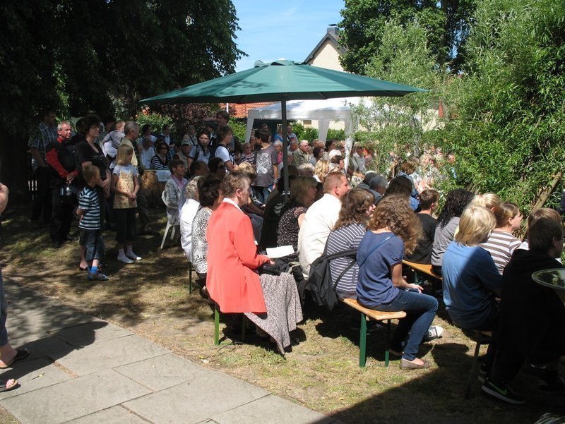 Die Buden vom MSC und ein großes Zelt waren schon vorhanden und bald waren auch Tische, Pavillions, der Grill und allerlei Zubehör und Deko an Ort und Stelle. Kurz vor Beginn des Gottesdienstes war dann alles bereit einschließlich der Kohle im Grill.Mit weit über 200 Besuchern begann das Gemeindefest in und um (da der Platz darin bei weitem nicht ausreichte) die Weidenkirche mit einem erfrischenden Gottesdienst. 40 Kinder mit 20 Erwachsenen als Begleiter gestalteten den Gottesdienst mit - und selbst als sie zum Kindergottesdienst in die Marienkirche umzogen, wirkte die Weidekirche mit ihren vielen Sitzgelegenheiten nicht leerer.